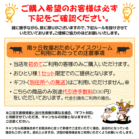 [ 南ヶ丘牧場のおためしアイス3種セット1,500円 ] ※代金引換払いをご利用の場合、手数料330円を頂戴いたしております。