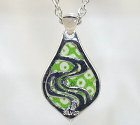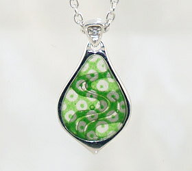 お手ごろ価格なのもいい感じです! 鹿の子文様が小粋な雰囲気・・・ さわやかな緑に鹿の子文 背面には流水文の透かし彫り 着用例 「友禅うつし」はシルバーアクセサリーに京友禅の伝統的な絵柄を独自の技法で写し込んだシリーズです。