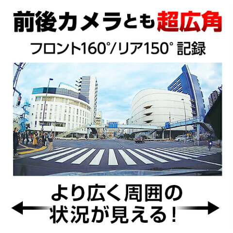 製品の仕様 JANコード 4968543713145 外形寸法 [フロント] 64(幅)×49(高)32(奥行)mm ※取付ブラケット(テープ貼付)装着時85(高さ)mm(窓ガラス25°想定の場合) [リア] 58(幅)×25(直径)mm ※取付ブラケット(テープ貼付)装着時35(高さ)mm(窓ガラス25°想定の場合) 本体重量 [フロント] 約69g(microSDカード含む) [リア] 約19g 記録媒体 microSDカード(16GB付属) 8〜32GB対応(Class10以上) カメラ 映像素子 [フロント]200万画素カラーCMOS [リア]100万画素カラーCMOS レンズ画角 [フロント] 対角160° [リア] 対角150° 最大記録画角*1 [フロント] 対角160°(水平138°、垂直85°) [リア] 対角150°(水平120°、垂直62°) 記録解像度 [フロント]200万画素 [リア]100万画素 1080P HD(1920×1080) ※フロントカメラのみ 720P(1280×720) GPS 有 Gセンサー 有(感度設定可能) 画質 [フロント]HDR 記録方式 常時録画 イベント記録(Gセンサー記録、ワンタッチ記録(手動録画)) 録画ファイル構成 1分、27分*2単位 音声 ON/OFF可能 フレームレート*3 [フロント] 27.5コマ/秒 [リア] 30コマ/秒 映像ファイル形式 MOV 記録映像再生方法 PC用 専用ビューアソフト Windows標準のWindows Media Player 電源電圧 DC12V(5V入力) 消費電力 5W 動作温度範囲 -10℃ 〜+60℃ 製品保証期間 1年(消耗品は除く) 付属品 5Vコンバーター付電源直結コード(約4m)(1) フロントカメラ用ブラケット(1) リアカメラ用ブラケット(1) リアカメラ用両面テープ(1) リアカメラケーブル(約9m)(1) ドライブレコーダー搭載ステッカー(1) microSDカード <16GB>(1) 保証書(1) *1 解像度により記録される視野角が変化します。